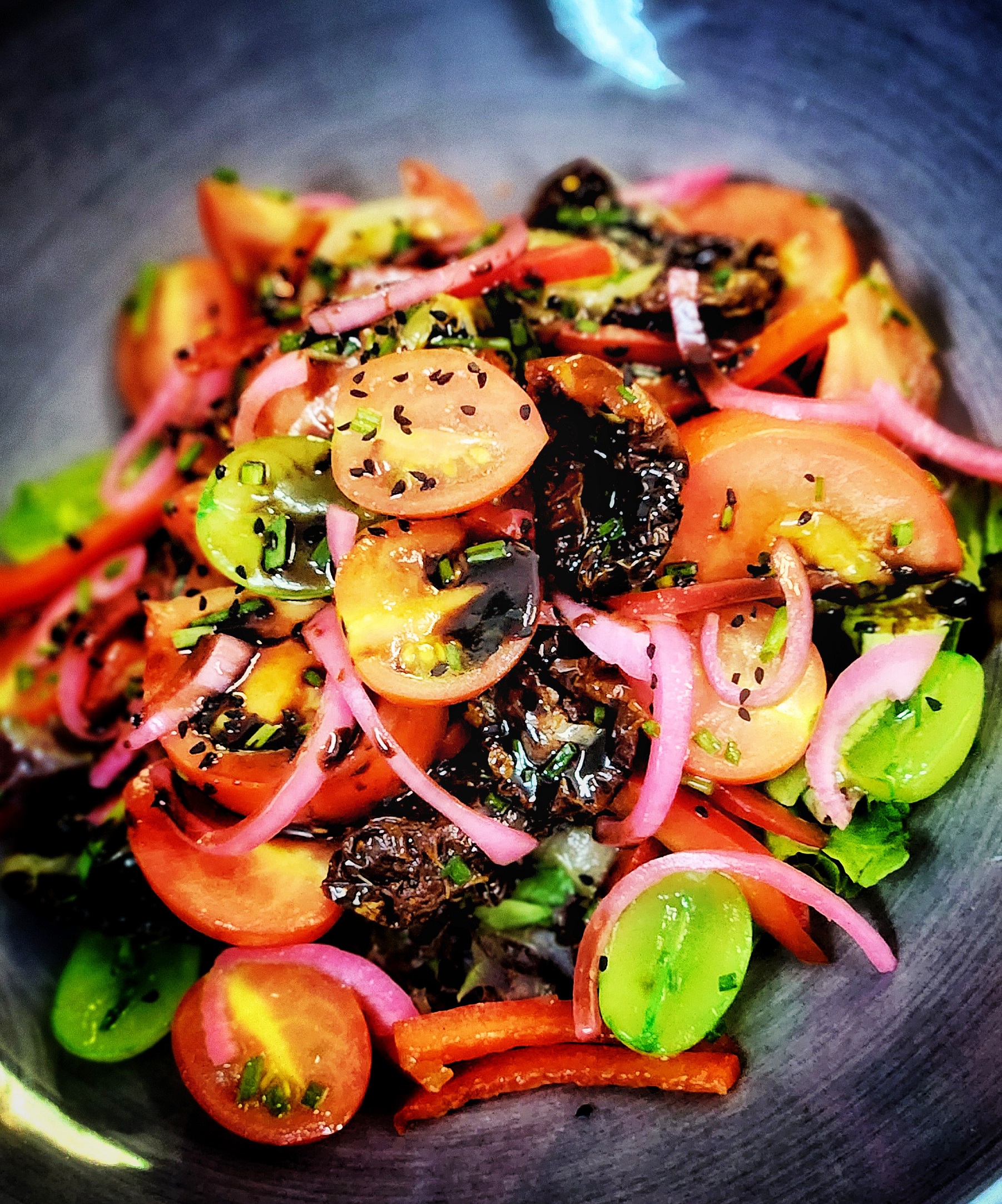 A mixture of confit cherry tomatoes, pickled green tomatoes, heirloom halves and oil-cured sundried tomatoes, dressed and topped with caramelised onion … yum!