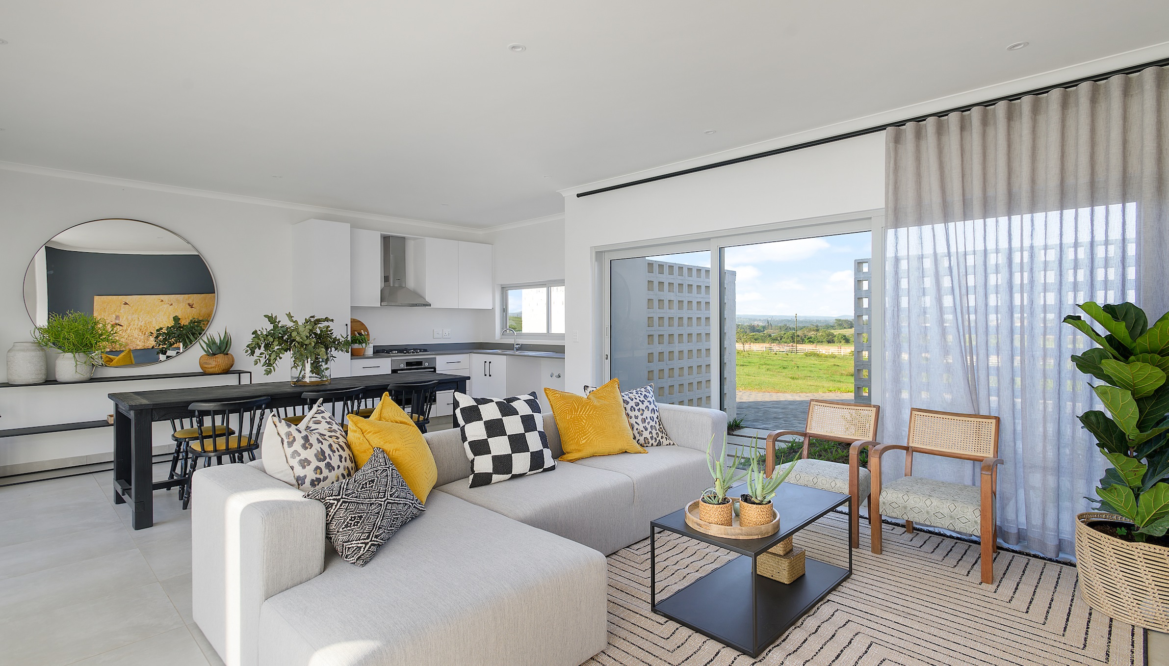 Space planning directs the functionality of a room. Critical things to think about include furniture placement and the flow of movement. “When I first walked into the house, I identified what already existed and couldn’t be changed and worked around that,” says Debbie. The custom-designed homes at Lalela Estate are configured with living in mind. You enter through a courtyard instead of an entrance hall, which would normally steal square metres from the living room. The glass doors on either side of the living area not only let in light but create a connected space that brings nature into the home while creating an expanse.