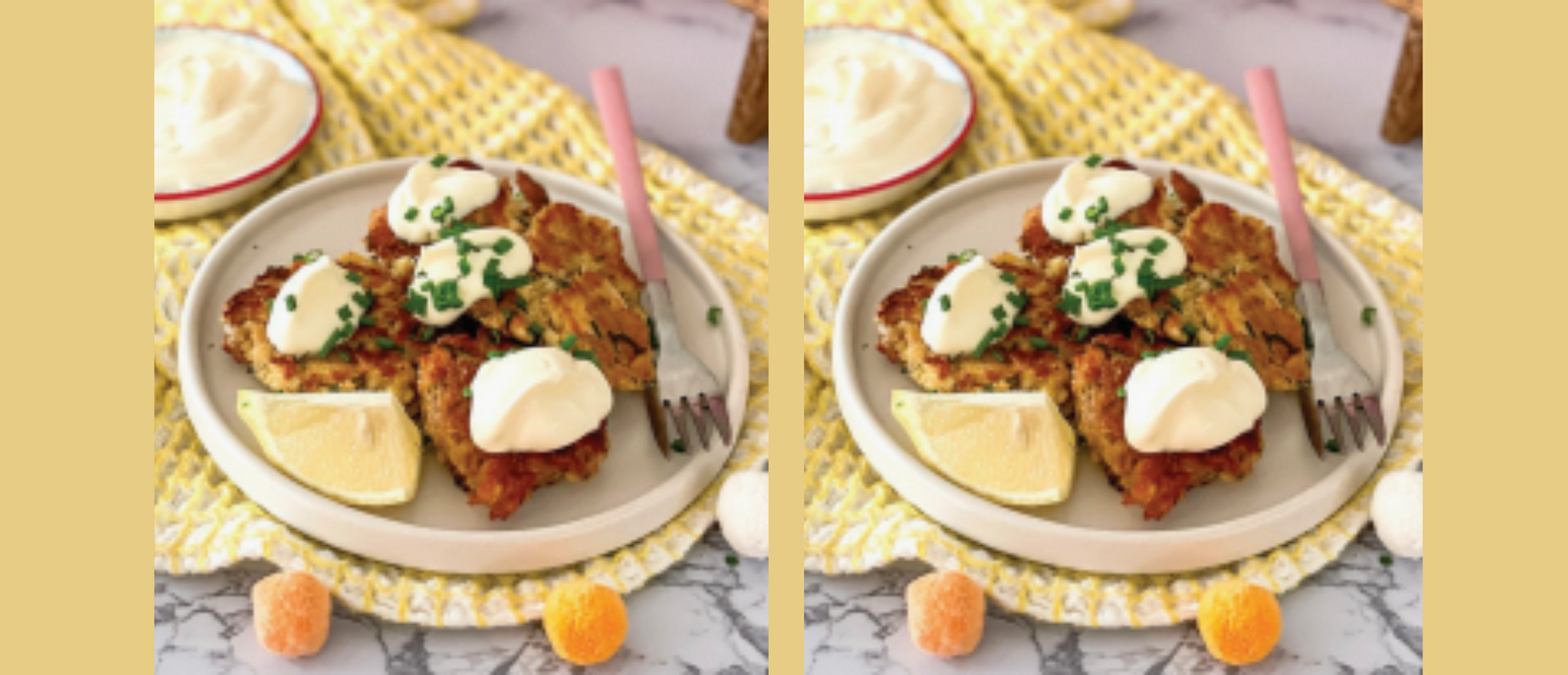 - Serve the fritters with dollops of sour cream, chopped chives and lemon wedges.
