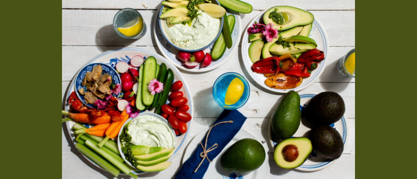 To serve, slice the avocados and arrange on a platter and drizzle with oil. Arrange the crudités and pita on the platter.