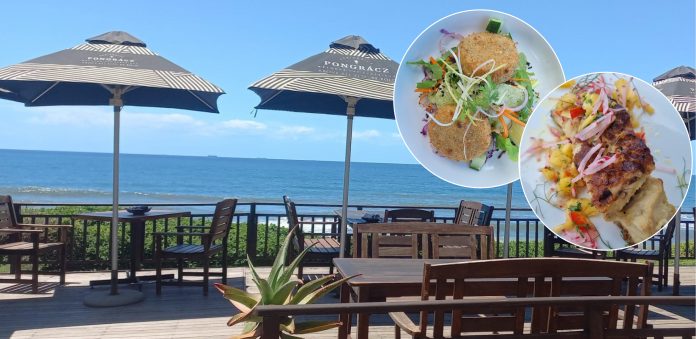 With a table on the deck and a stunning sea view, we started our lunch with a chilled glass of wine and a warm focaccia bread. Then, we sampled the coriander and chilli fish cakes – served with a tasty basil pesto aioli, they had just the right bite of spice; and the smoked salmon trout and deep-fried aubergine, which was served with cream cheese and an absolutely delicious avocado relish. The starters were light and fresh and a great choice to wake up the taste buds.