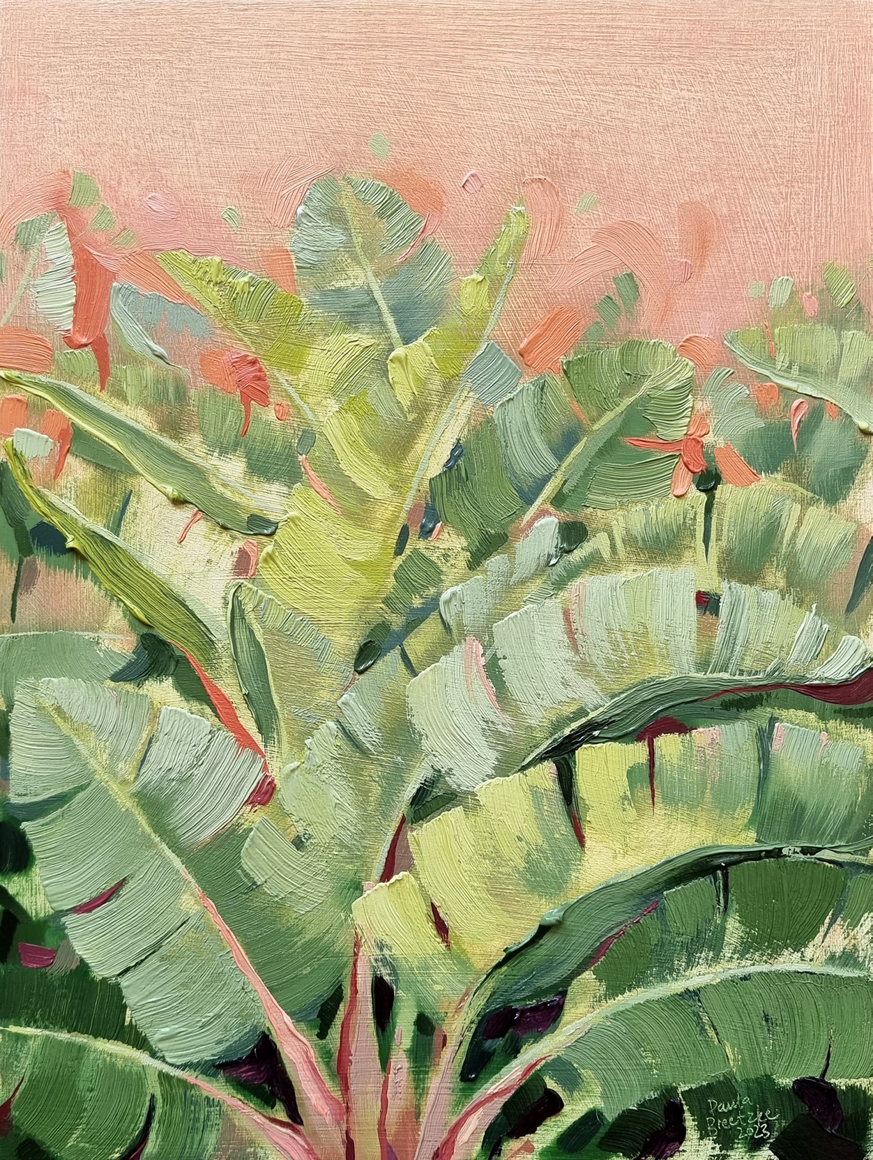 Mesmerising seascapes, tropical plants, cheeky monkeys and a colour palette that’s rich in sunrise hues… Paula Breetzke’s art is inspired by her home in Blythedale.