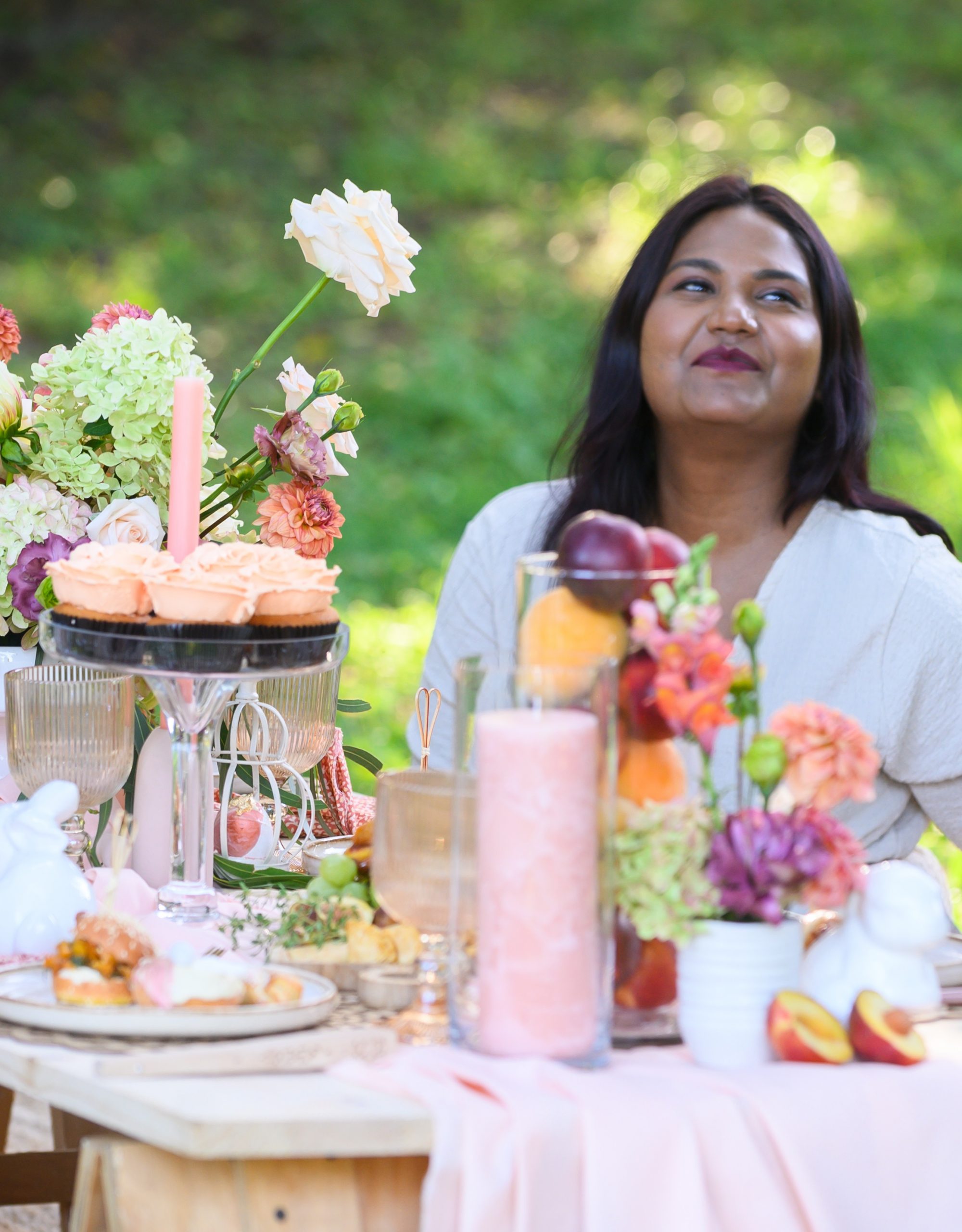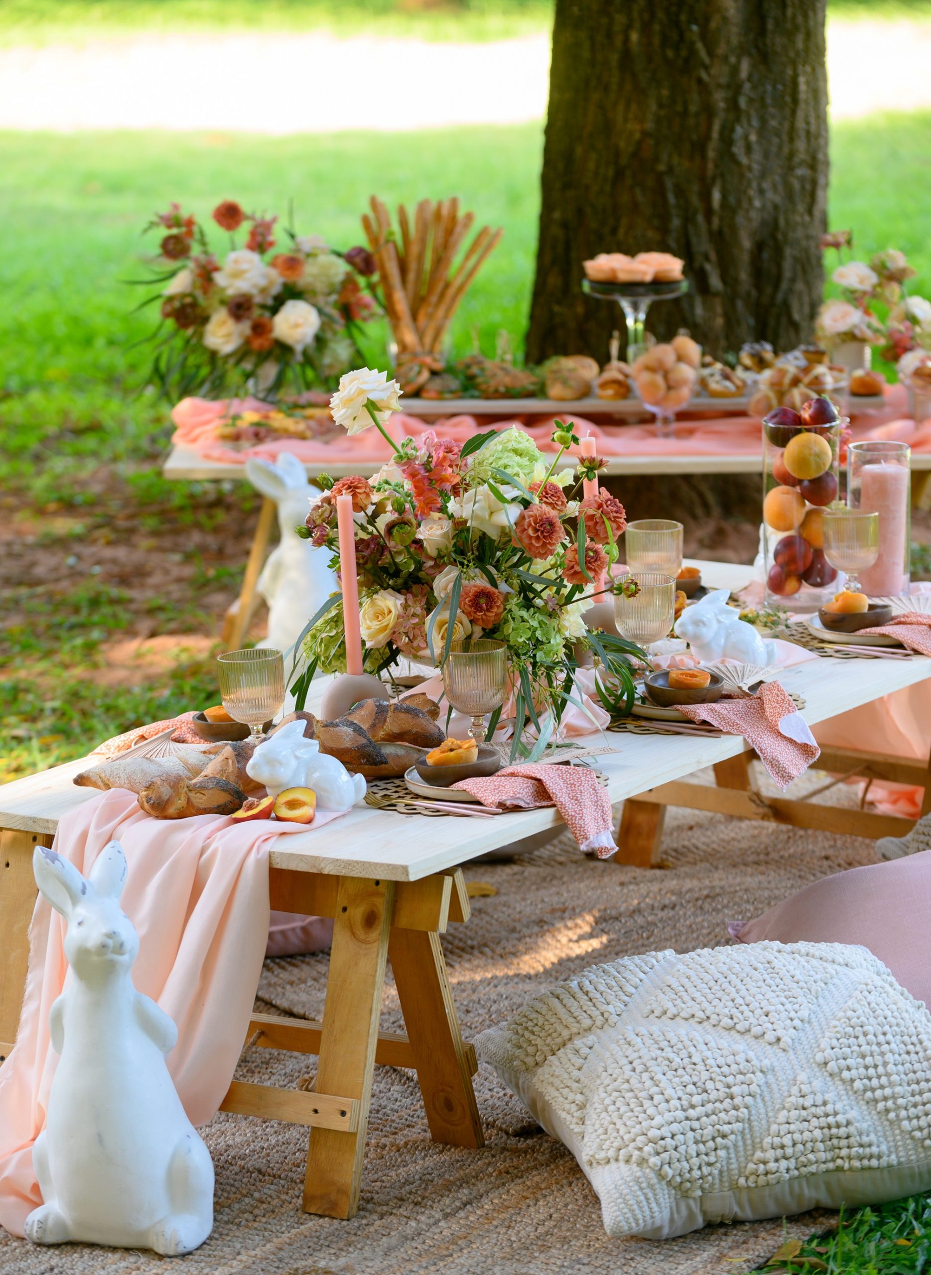 In terms of floral design, Ro decided to break with a traditional tablescape and chose instead to place a large arrangement to one side of the table to create space for the food. Extra candles and large jars filled with fresh peaches added to the overall aesthetic. In a subtle nod to Easter, she placed white bunnies on and next to the table, and tied the peach palette together with cutlery and glasses in the soft, elegant shade.