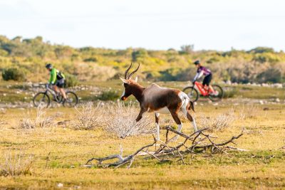 Friday 17 May kicks off with a short Sunset Scramble warm-up ride of 12km at 4pm – ride off into a spectacular sunset where Bontebok perfect the picture of pristine white dunes in the background, cycle past the stunning new De Mond Lodge situated on the edge of the Vlei and return in a clockwise direction to De Hoop Opstal. On Saturday 18 May it’s the 50km with 850m ascent and on Sunday 19 May, the 62km with 800m ascent. The routes are a combination of gravel road, jeep track and singletrack. Each day’s route takes you to a different part of the reserve where you can appreciate the rocky coastlines, large sand dunes, beautiful blue ocean- whale-spotting is a highlight, lowland fynbos and thriving wetlands. Game you’re likely to encounter include Eland, Cape Mountain Zebra, Grey Rhebok and Bontebok. Caracal and Leopard maybe spotted by a lucky few!