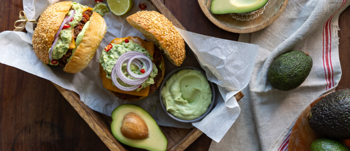 - For the burgers, roughly mash the avocados, lime juice and mayo. Season with salt and pepper. Blitz ¼ of the mixture with the garlic and 30 ml (2 tbsp) extra mayonnaise to form an Avo Aioli sauce. Fold the coriander and chilli through the remaining smashed avo.