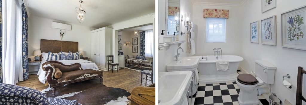 The hotel is glorious … with firm nods to the historical Cape Dutch influence and traditional Karoo aesthetics. It’s all plush armchairs and sofas and acres of botanical and bird prints, walls of antelope skulls and antique writing tables, and carefully curated ornaments. The gardens are magnificent, landscaped to perfection, with sculptures in the grounds, and many rooms – once old workers’ cottages – grouped around central, private pools, with loungers to relax in and quiet little nooks to hide with a book and a bottle of wine.