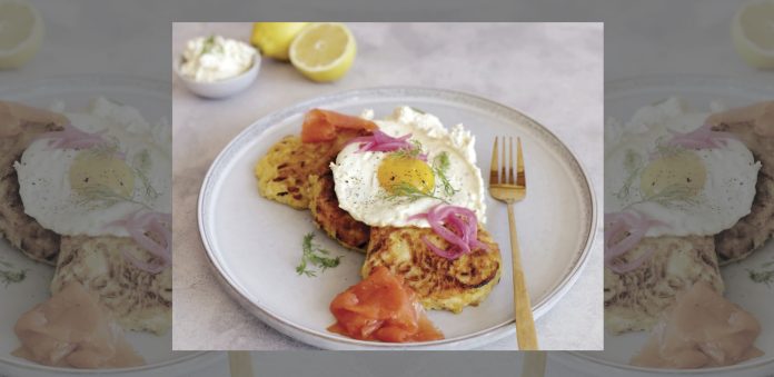 To serve, stack a few fritters on top of one another, add a big dollop of lemon feta cream cheese, then garnish with dill and a generous helping of pickled red onion. Add a healthy helping of fresh smoked salmon to the side. For that extra hit of protein and goodness, top with a fried or poached egg.