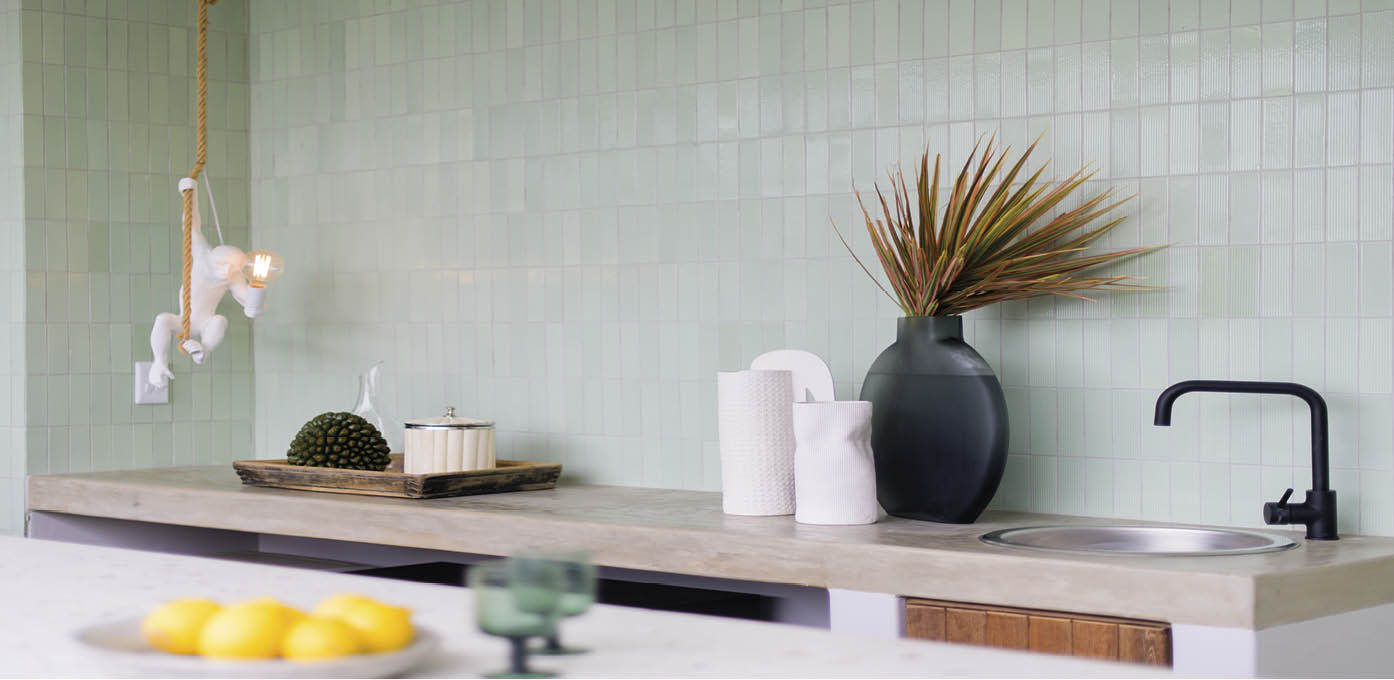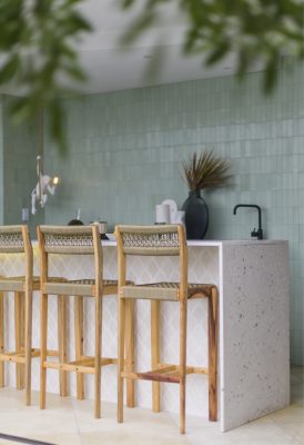I love the tiled wall in the bar. These tiles are locally made by Kalki Ceramics, and the glaze is so alive, it seems to reflect the ocean opposite. They really bring life to the space! I also like the bespoke concrete terrazzo bar waterfall top we had made specifically for the space. This style of concrete is a great material for indoor and outdoor spaces as it is durable, easy to clean and delivers a pared-back look.