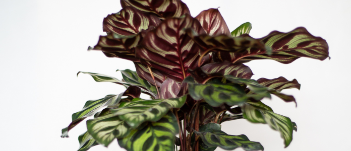 It’s easy to fall in love with Calathea because every single variety is different. They have what’s been described as designer foliage, usually boldly patterned or striped in varying shades of green and white, often with a burgundy under leaf.