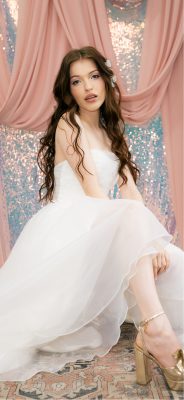 There’s also a playful, slightly childlike element to it, which aligns with how we approach dress shopping. We always tell our brides to “come play dress-up” – like we’re six years old again, trying things on for the joy of it. From there, I explored how iridescence could translate into a bridal space, sourcing fabrics, prisms and props until it all came together.