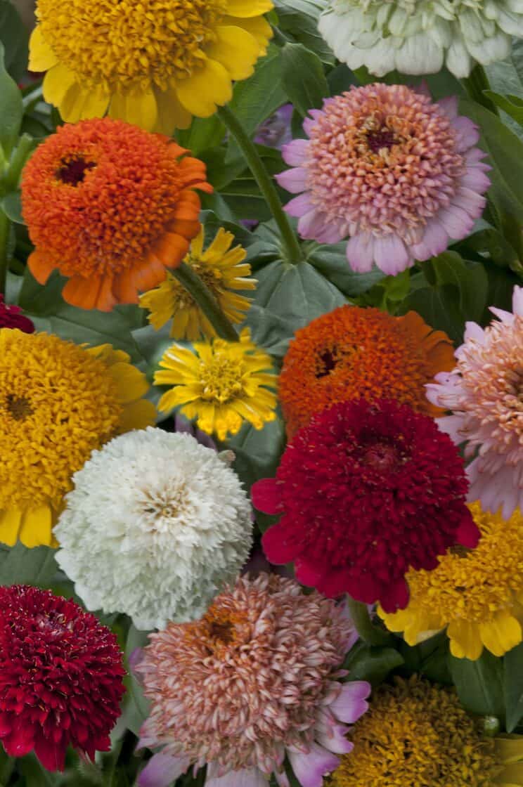 - Marigold ‘Sugar and Spice’ which has large, double carnation type creamy yellow flowers that mature to white and Zinnia ‘Jazzy Mixed’ are compact bedding flowers for smaller gardens or for showing off in larger beds, while still providing blooms for the vase.