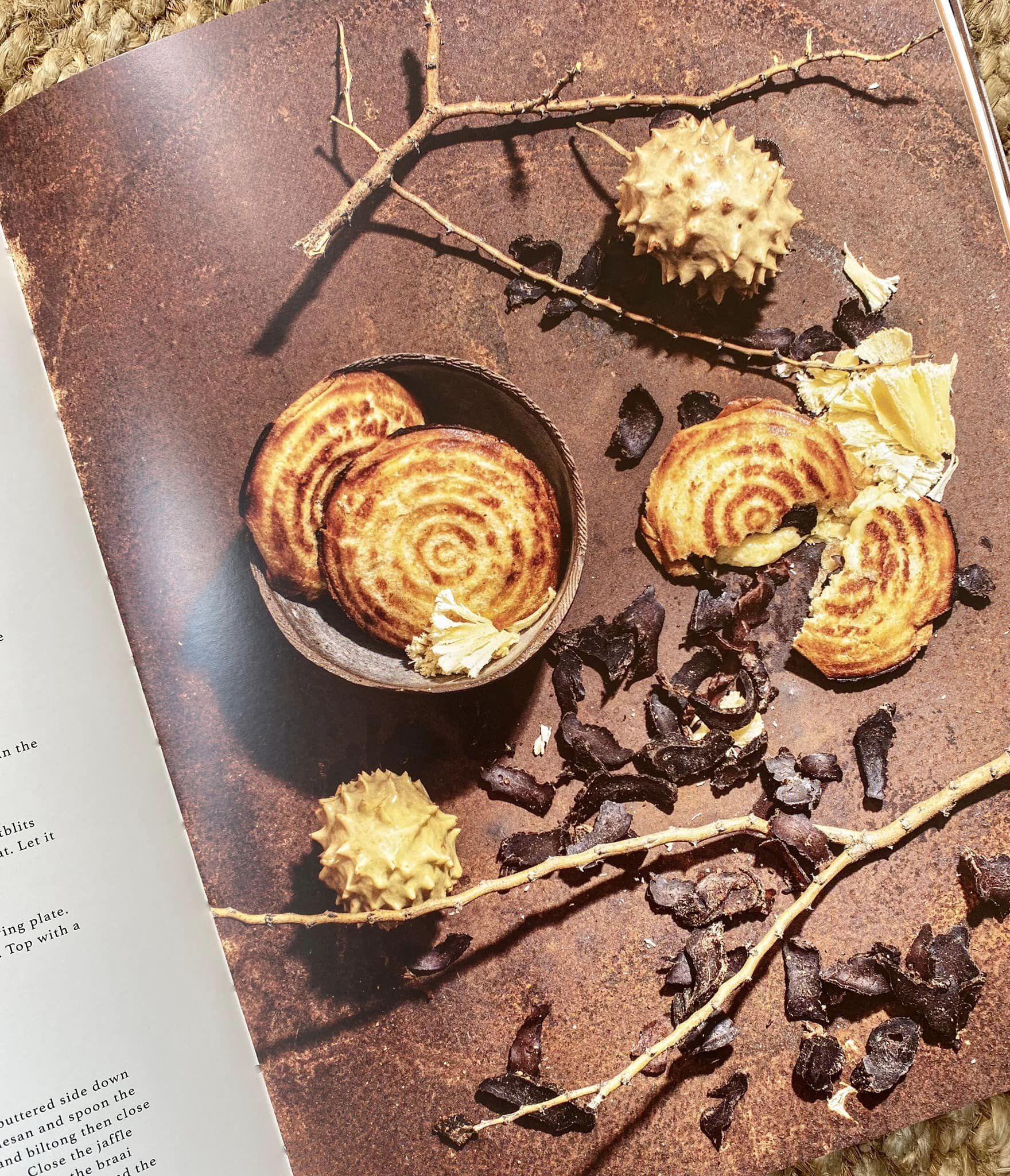 And then, of course, there are Jan’s recipes. There are some that are going to take time, and a little effort, and won’t be to everyone’s taste… Skilpadjies with pickled cabbage and curry tripe, for example. And Pofadder with whipped feta, which includes lamb kidneys and livers and pig casing and is only for those not offal-shy. But then there are dozens and dozens of recipes that you’ll just use over and over … from the Stoep Drinks and Small Bites chapters (Mampoer Cocktail with peach jelly alongside Klein Spek Souttertjies before your next braai), to the preserved peaches and salted lemons and Tsama Melon Konfyt, proper roasted pumpkin soup and the quintessential South African bread Mosbolletjies. There are glorious dinner party mains (the stunning kudu fillet stuffed with venison sausage and red wine), and more casual braai options (jaffles with biltong and cheese … such a hit!).