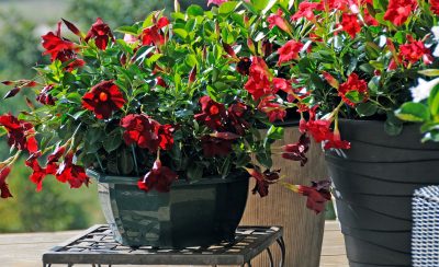We’re planting … Dipladenia Diamantina (Jade Scarlet) in pots or hanging baskets for the patio. This is the first really compact, bushy Dipladenia that fills its container with bright red trumpet-shaped flowers. Plants perform best with plenty of morning sun and some afternoon shade, so don’t position them against a hot, west facing wall. Water when the topsoil feels slightly dry. Fertilise monthly in summer and trim to keep neat. Details: ballstraathof.co.za