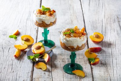- In pretty glasses layer the biscuit crumbs, peaches and cream cheese.
