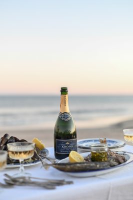 The saline complexity of Krone’s Borealis Cuvée Brut makes the ideal pairing for the simplest of seafoods, best served on the beach. I was able to realise my concept of a table set seaside and orchestrated a West Coast-themed shoot with a vintage table and chairs set up on the shoreline, using summer’s early pearly sunrises as a backdrop. I opted for local seafood in the form of Saldanha Bay mussels and harders fresh off the boats in Velddrif.