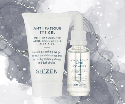 Sh’zen Anti-Fatigue Eye Gel is a cooling, soothing gel with Hyaluronic Acid, which plumps up eye contours and reduces puffiness and dark circles. R355. The Hyaluronic Acid Complex is a multi-beneficial corrective serum which targets fine lines, dullness and dehydration. R499 from sh-zen.co.za