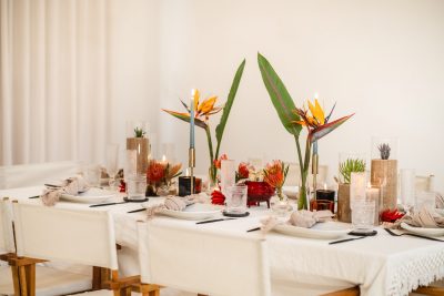 Event planner and stylist Raquel Thomas of The Socialite blended elegance with local flair for her Heritage Day table. A neutral linen base lets bold strelitzia and pincushion proteas shine, while mini potjie pots add a playful nod to heritage. Textured glassware, black cutlery, sandy vases, tall candles and earthy botanicals complete the look.
