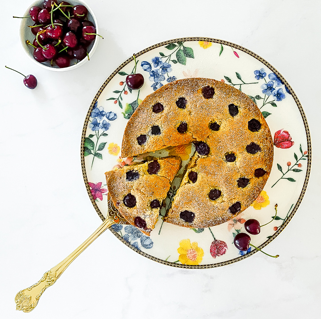 You’ll need: 250g Fresh Cherry Time cherries pitted (pprox.. 250 – 350g); 113g unsalted butter softened to room temperature; 150g golden caster or light brown sugar white/ castor will also work if needed; 2 large eggs; 5ml vanilla extract; 64g all-purpose/ cake flour; 2g baking powder; 1.5g salt; 100g ground almonds/ almond flour; icing sugar for sprinkling/ decorating