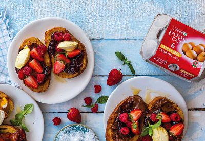 You’ll need: 4 slices of bread of your choice, 4 SPAR Eggs, ¼ cup SPAR Cream, a pinch of salt, 2 Tbsp SPAR butter, a dash of vanilla essence, 1 Tbsp SPAR Castor Sugar, 1 punnet SPAR Freshline Berries, SPAR Squillos Chocolate Hazelnut Spread to taste, SPAR Mixed Berry Jam to taste, mascarpone to taste.