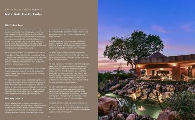 Marvel at … Sabi Sabi Earth Lodge, set in the Sabi Sands region of the Greater Kruger National Park, it has a hidden entrance passage and is tucked into a gentle slope of natural grasslands, blending effortlessly with the landscape, and remaining hidden from even the wildlife that often venture through, or around the lodge. It’s a living gallery of the senses … all graceful curves, interplay of light, and rich natural textures which create a soothing harmony that echoes the beauty of the landscape itself.