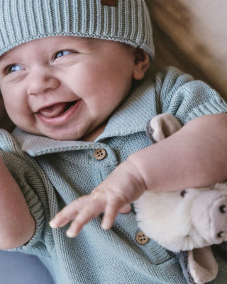 Collard dusty blue romper, R499, and knitted beanie, R219 from bubbadue.com