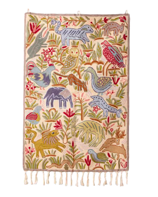 Meticulously hand- embroidered wool folk art Shalimar Jungle safari wall tapestry, made in tiny limited batches, with no two pieces the same. R7699 from movaliving.co.za