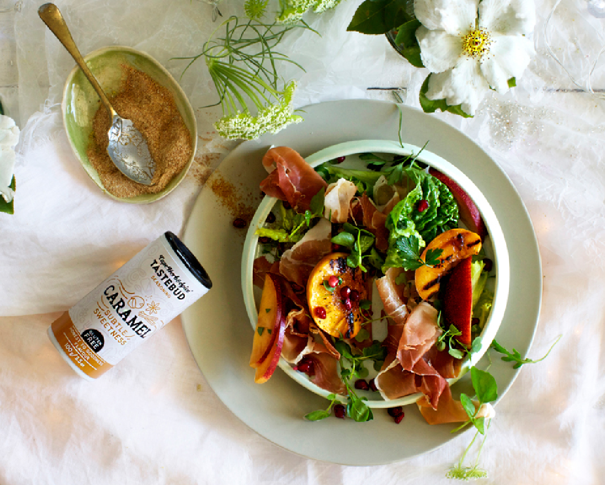 Salads that are a complete meal are such a perfect warm weather lunchtime treat. This salad offers juicy subtle sweetness in the form of roasted peaches dusted with the new Tastebud Caramel spice. Umami richness appears care of thin slices of prosciutto. Add crunchy green leaves and herbs, pops of festive red pomegranate and a light vinaigrette and it’s our idea of happy on a plate. You can make the roasted caramel peaches under your grill, but why not take it outside to the braai grid? It’s summer after all!