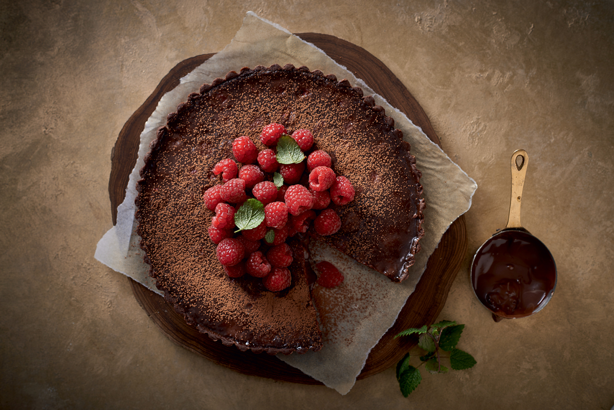 To make: For the chocolate pastry, sift the flour, cocoa powder and icing sugar into a mixing bowl and add salt. Add cold butter and work into the flour, using your fingertips, until mixture resembles breadcrumbs. Beat egg yolk with water, add to the flour mixture and mix until dough comes together. Turn out onto a lightly floured surface and knead briefly until smooth. Wrap in clingfilm and place in the fridge for 20 minutes. Then roll the pastry out on a lightly flour-dusted surface and line a 25cm loose-bottomed tart tin. Chill in the fridge for 20 minutes. Preheat oven to 190°C. Blind bake the pastry case for 12 – 15 minutes. Remove from oven and allow to cool.