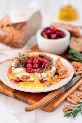 You’ll need: 100g frozen cranberries; 150g Staffords cranberry jelly; 1tsp chilli flakes; one 250g wheel of Camembert or Brie cheese; 50g walnuts; 3 sprigs rosemary