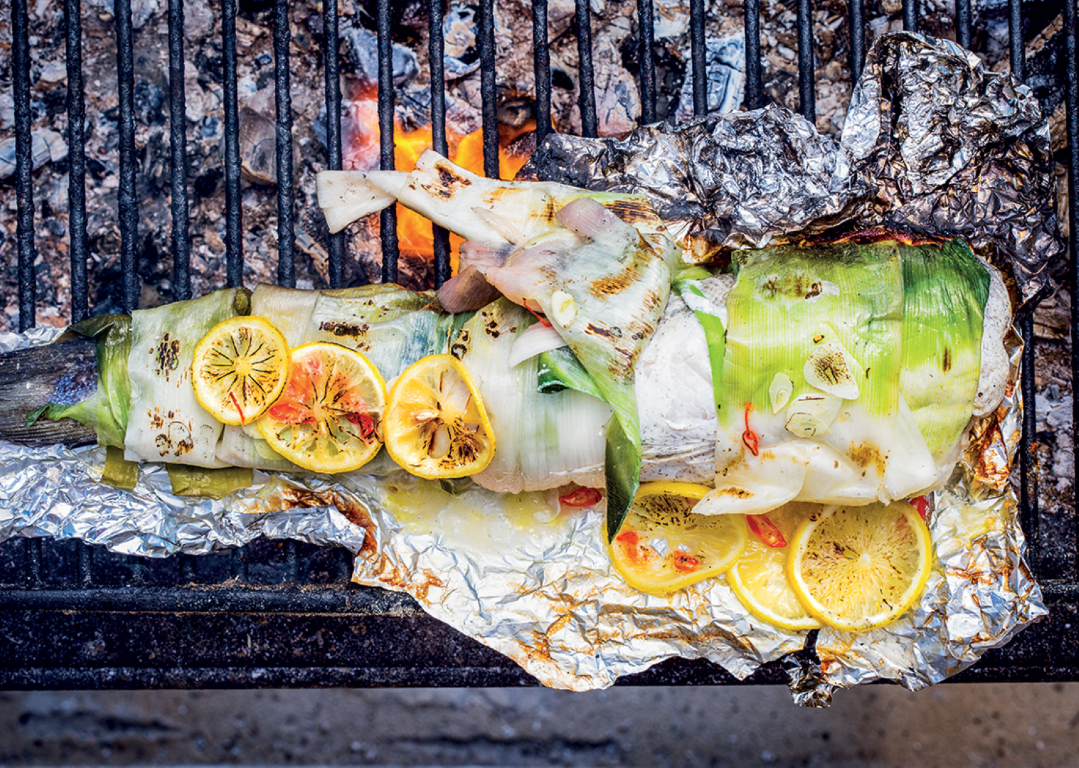 Cook’s note: A whole fish cooked in a foil parcel over the coals guarantees juicy, fall-apart tenderness and smoky flavour. For extra points, serve it with home-made aïoli.