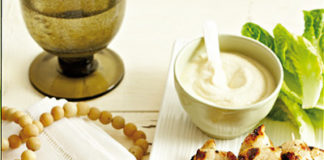 Grilled chicken skewers with hummus-yoghurt sauce